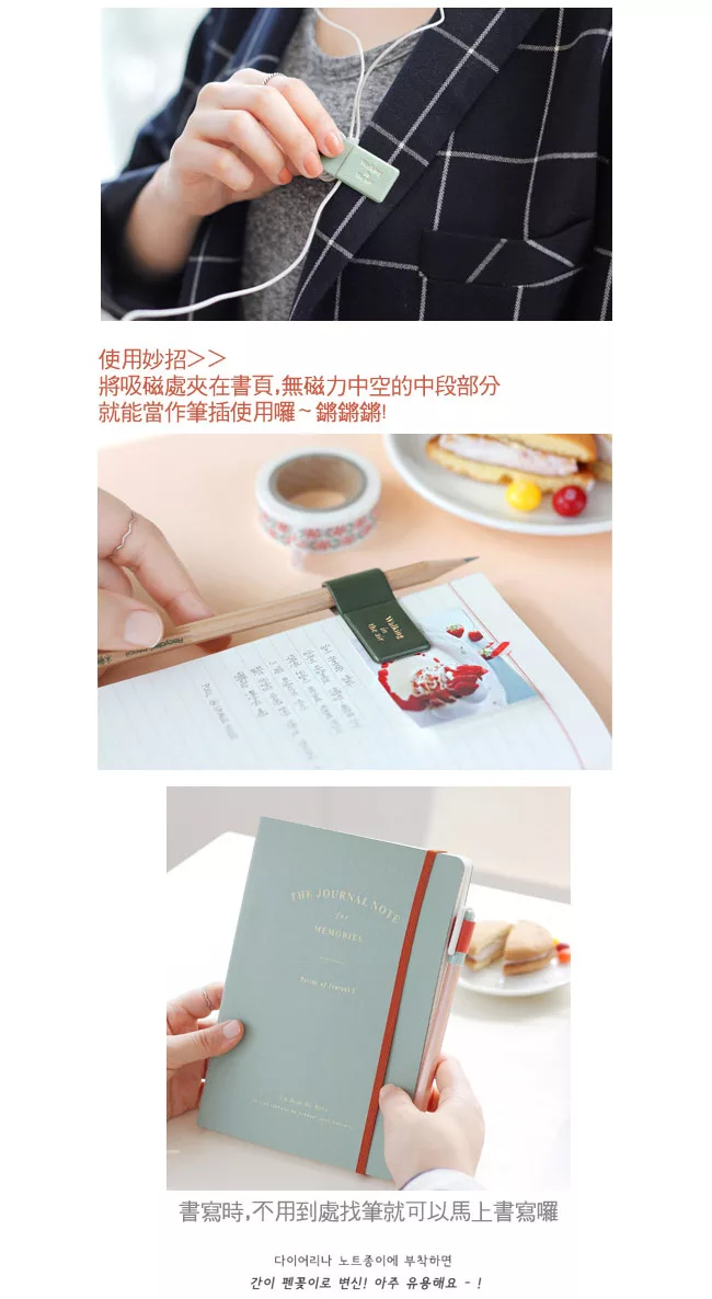 使用妙招>>將吸磁處夾在書頁,無磁力中空的中段部分,就能當作筆插使用囉~鏘鏘鏘!